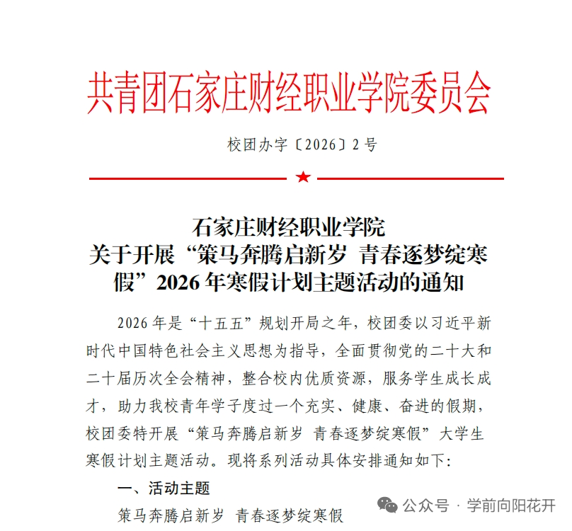 岁序更替,骏驰新程。2026马年寒假已至,为让大家在假期中深耕家乡文化、践行青春担当,我们特推出“家乡文脉传承”与“志愿服务·青春奉献”两大寒假主题活动,邀你以脚步丈量故土,以行动温暖社会,在体验与实践中收获成长,解锁二课学分!