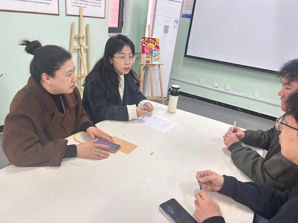 为贯彻落实《高等学校课程思政建设指导纲要》精神,推动美术教育与思政育人深度融合,2025年4月15日,伟德官网美术教研室在实训室C403举办了“专业课与思政课融合教材编写”专题教研活动。本次活动由美术教研室主任尹伊蓉主持,专业课教师张有军、杨江科、郝鹏及思政课教师张迎共同参与。
