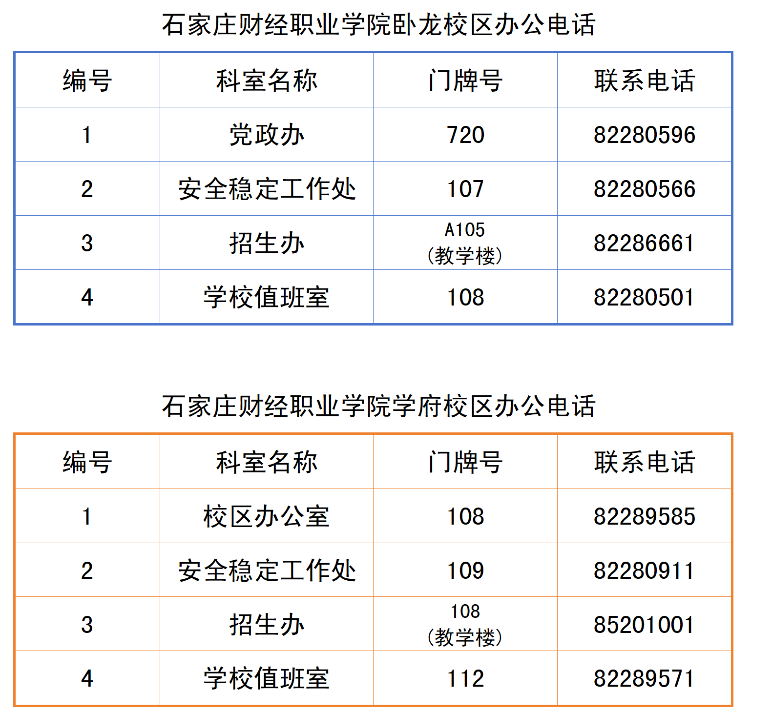 地址:石家庄市鹿泉区卧龙路99号电话:0311-82280596(卧龙院办) 82286661(卧龙招办) 82286662(卧龙招办)地址:石家庄市新华区学府路236号电话:0311-82289585(学府办公室) 85201001(学府招办)传真:0311-82280615