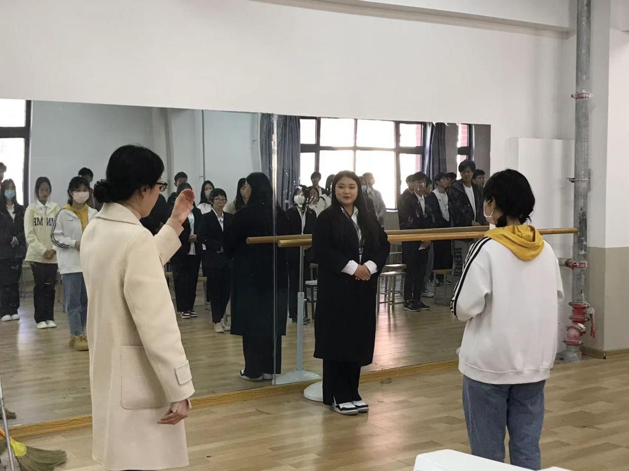 罗老师以讲解员的基本任务和素养开篇,从礼仪规范、表情仪态、站姿坐姿、手势运用四个方面为同学们进行了细致深入地讲解。她讲到,讲解员首先要有良好的仪容仪表,衣着要得体、整洁、庄重、大方;言行举止要从容得体,做到微笑迎宾、主动热情;讲解时态度要诚恳、亲切,语气自然清晰、张弛有度;讲解手势要适时、优美、协调。只有这样,才能更好地与来宾交流情感,传递知识。在练习标准站姿、手势引导时,罗老师对每一位同学耐心指导、纠正,向大家展示专业的讲解仪态,以理论讲解+情景演练+实操练习+现场互动的课程形式将礼仪知识倾囊相授。
