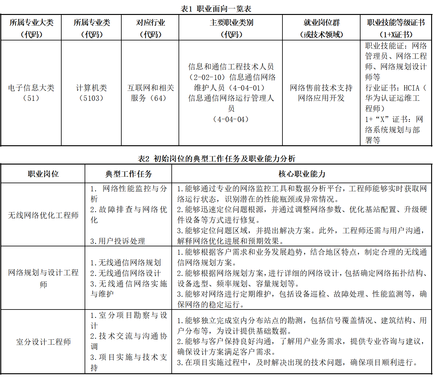 本专业培养能够践行社会主义核心价值观,传承技能文明,德智体美劳全面发展,具有爱岗敬业、勇于创新的职业精神和精益求精、追求卓越的工匠精神,具备较强的就业创业能力和可持续发展的能力,掌握路由交换技术、网络规划与设计、网络规划与优化等专业知识和技术技能,具备职业综合素质和行动能力,面向通信产业的网络规划、设计人员、网络优化人员、工程设计与运维人员等职业,能够从事网络设计与优化、光通信、基站设备调试、无线通信网络分析、通信平台产品开发、通信工程实施、网络技术服务与运维等工作的高素质技术技能人才。