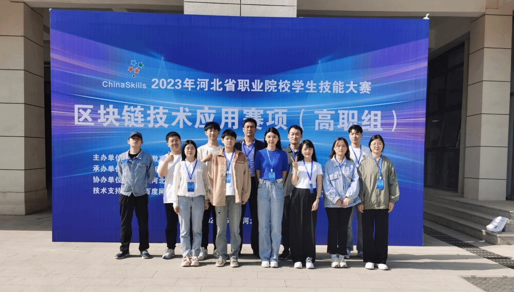 2023年5月8日,石家庄财经学院信息工程学院张永昌院长带队参加了“区块链技术应用”赛项报道。信息工程学院共派出了两支参赛队伍,1队由袁雨蒙和张浩然老师指导,2队由刘天宇郑雅洁老师指导。下午3点,举行了“区块链技术应用”赛项开幕式。下午3点30分领队张永昌院长参加领队会,指导老师带领学生去熟悉赛场。下午4点参赛队成员在校门前广场合影留念。